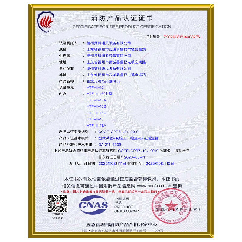 HTF排煙風機3C證書